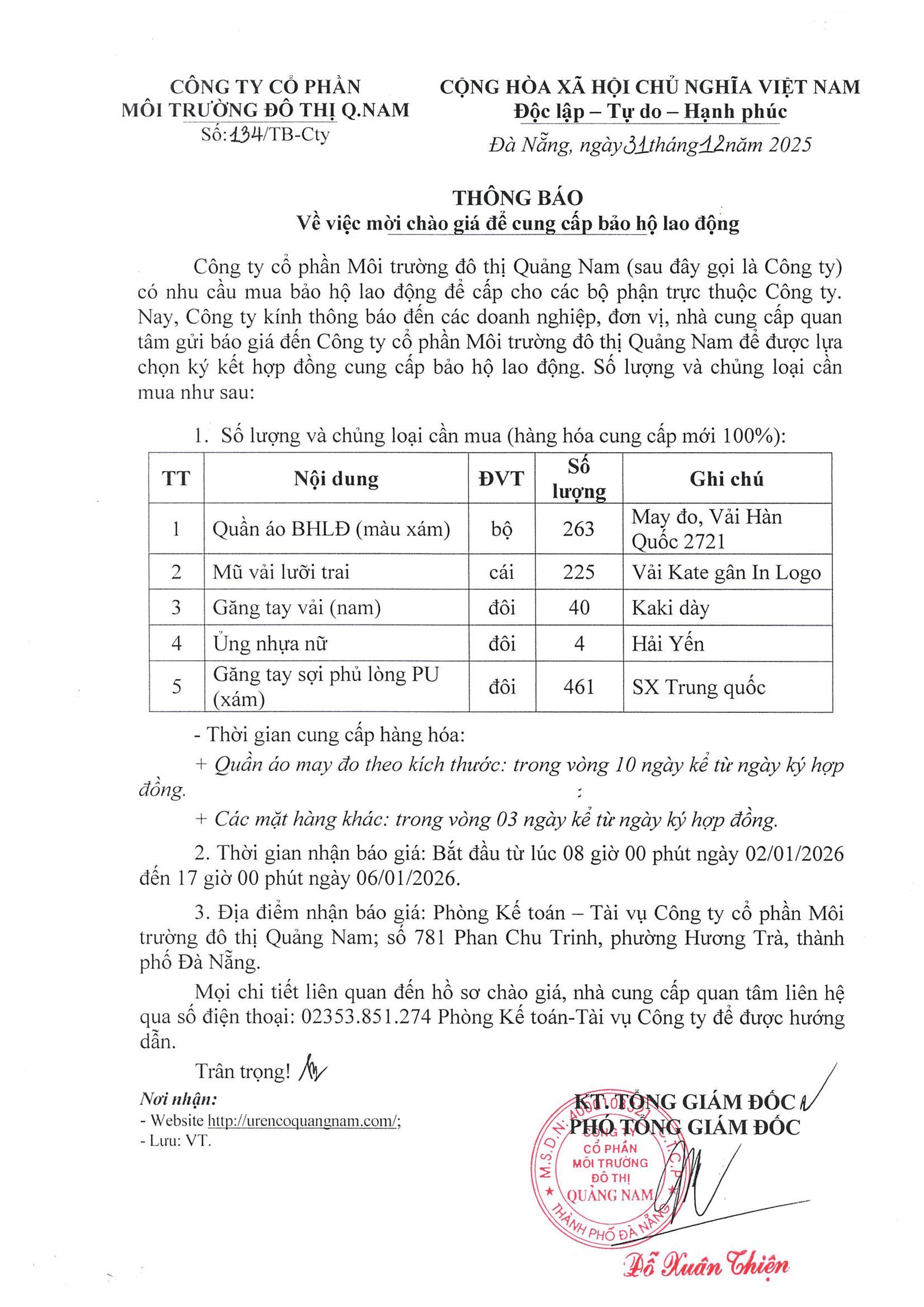 Thông báo mời chào giá để cung cấp bảo hộ lao động (TB 134 31.12)