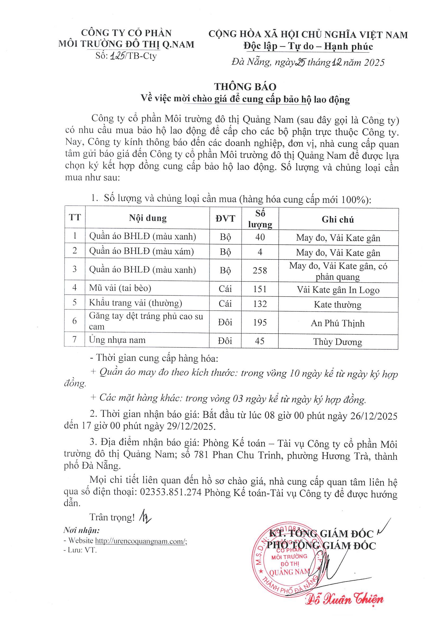 Thông báo về việc mời chào giá để cung cấp bảo hộ lao động