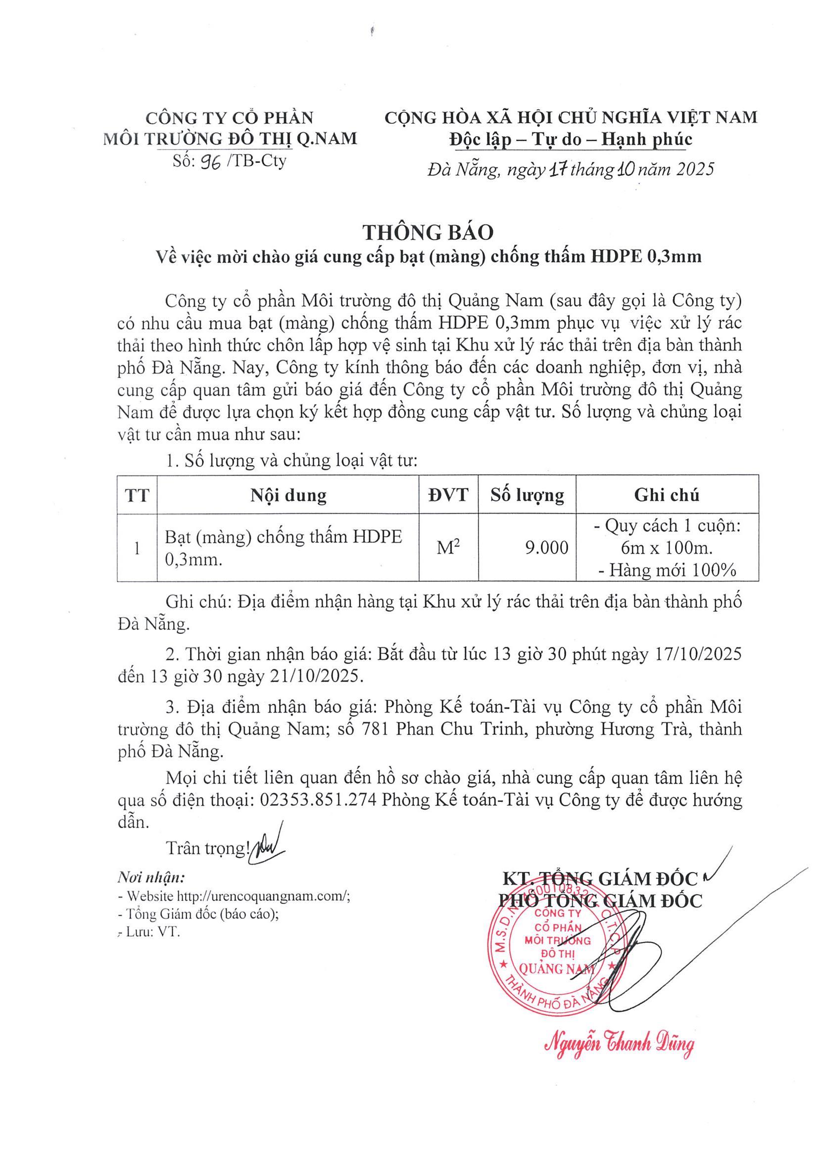 Thông báo v.v mời chào giá cung cấp bạt (màng) chống thấm HDPE 0,3mm (TB 96.2025)